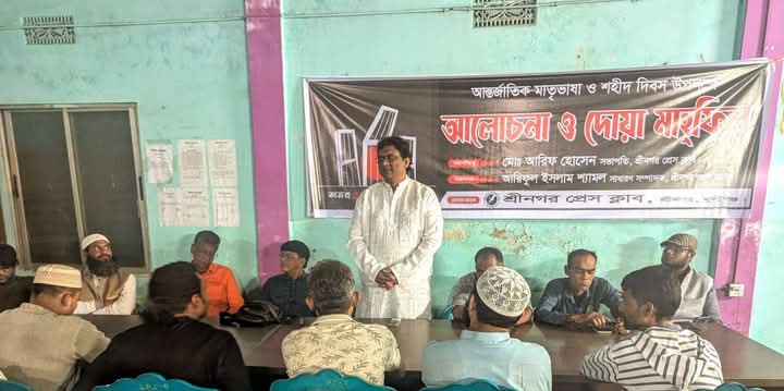 শ্রীনগর (মুন্সীগঞ্জ) প্রতিনিধি: মহান শহীদ দিবস ও আন্তর্জাতিক মাতৃভাষা দিবস—২০২৫ উপলক্ষে শ্রীনগর প্রেস ক্লাবের আয়োজনে আলোচনা সভা ও দোয়া মাহফিল হয়েছে। বৃহস্পতিবার রাত সাড়ে ৮ টার দিকে শ্রীনগর প্রেস ক্লাব মিলনায়তনে এই সভা অনুষ্ঠিত হয়।